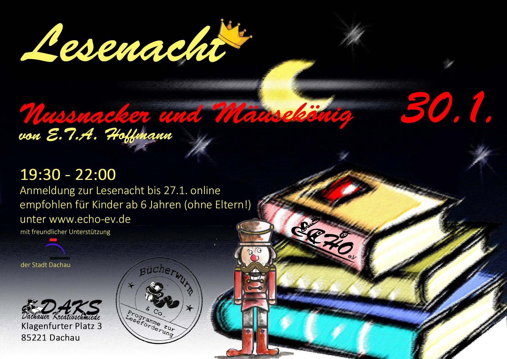 Ein zeitloser Märchenklassiker von E.T.A. Hoffmann spielt die Hauptrolle bei der nächsten Lesenacht für Kinder im DAKS: Die Dachauer Kreativschmiede lädt am Freitag, 30.1. von 19:30 bis 22 Uhr wieder alle Kinder ab 6 Jahren ein zu einem gemütlichen Abend mit spannenden Vorlese-Abenteuern. Die professionellen Vorleserinnen im DAKS erwecken die Figuren aus Hoffmanns berühmter Erzählung „Nussknacker und Mäusekönig“ zum Leben.